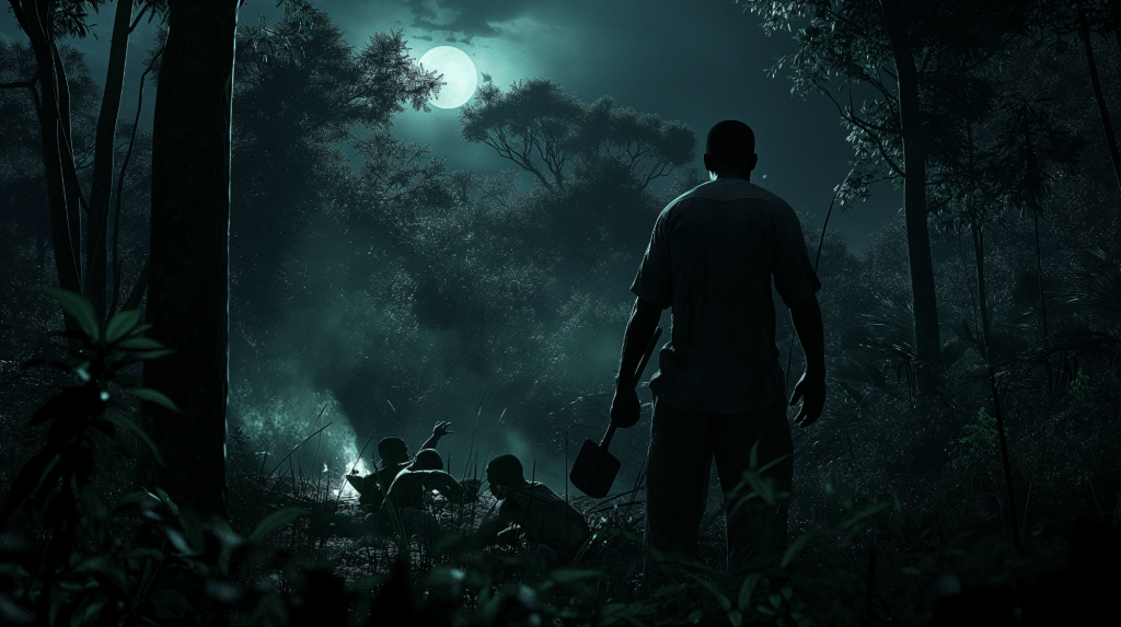 Around a campfire, laughing over stolen loot. He waited until the moon hid behind clouds, then struck like a shadow. Three shallow graves were left behind the campfire ashes.