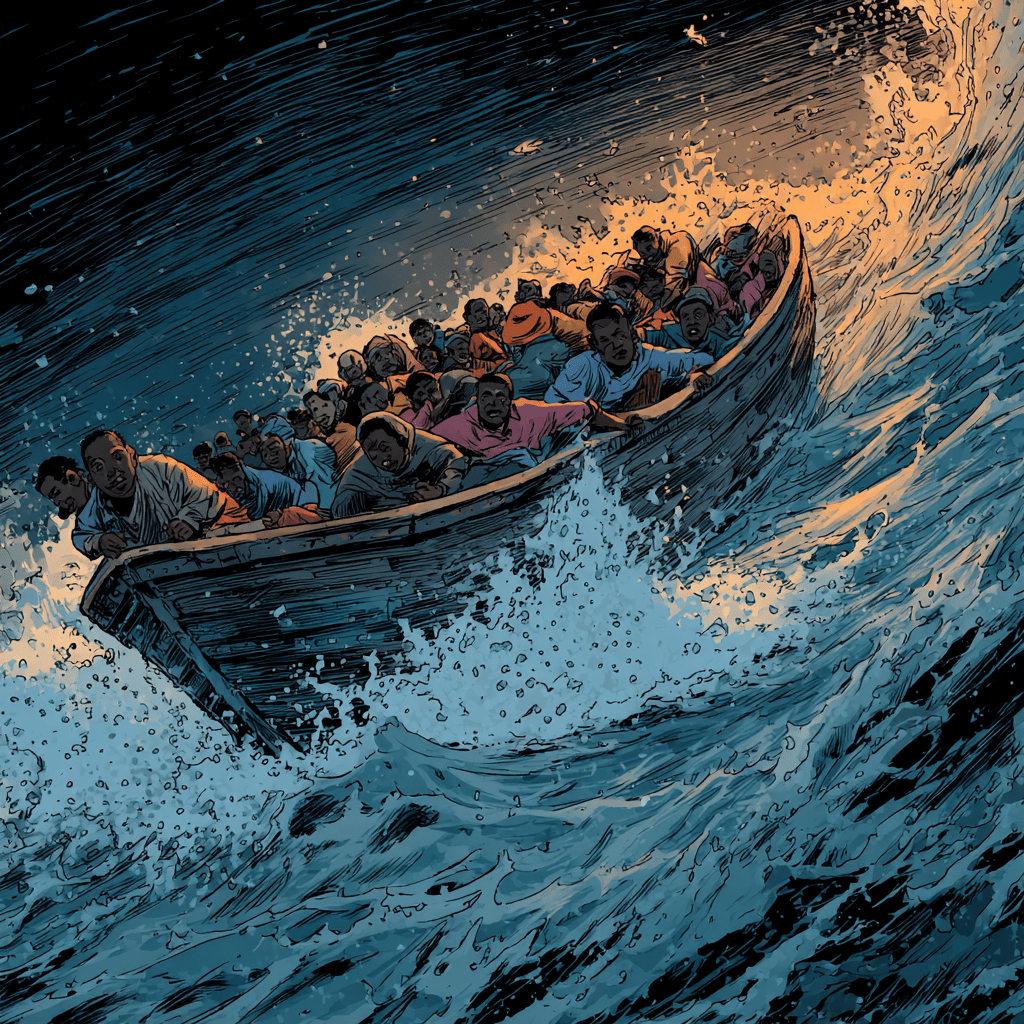 At the Libyan coast, he boarded a rickety, overcrowded boat bound for Italy. The sea stretched endless and dark, a monster waiting to devour them. On the third night, a storm tore through their fragile vessel. Waves higher than trees slammed against the boat, and people screamed as water swallowed them whole.