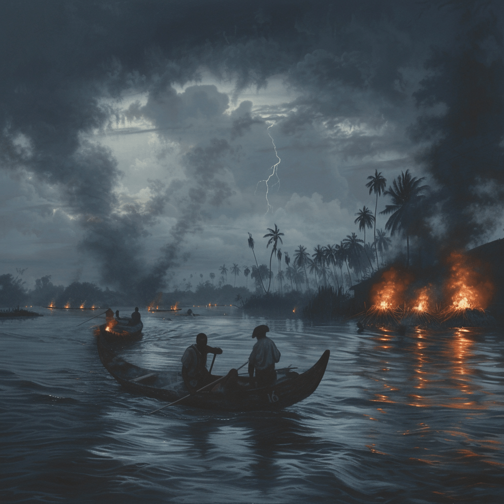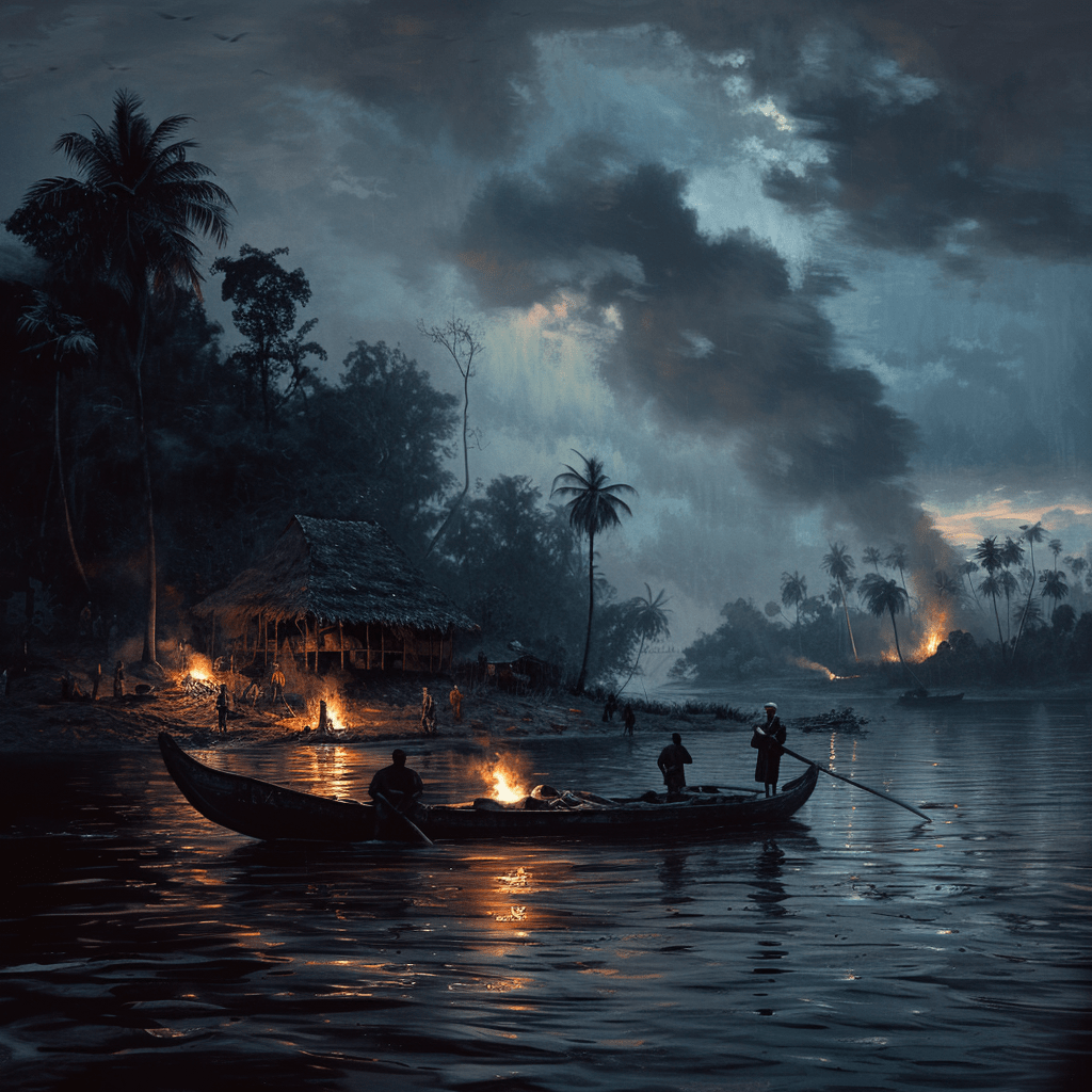 By nightfall, we reached the village of Aboh. Fires burned along the banks, casting long shadows across the huts clustered like watchful eyes. The people were waiting. Not with smiles or songs, but with a heavy, unnerving stillness.